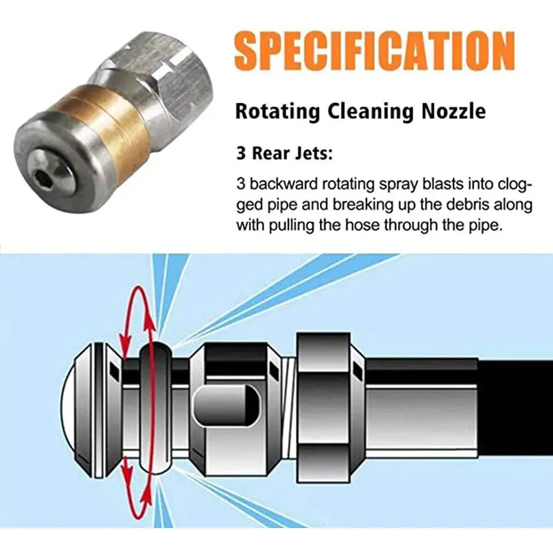 Amplia aplicación: Esta boquilla de alcantarillado fija de acero inoxidable se puede aplicar ampliamente en aplicaciones limpias como alcantarillado general, limpieza de drenaje, limpieza de tuberías industriales y tubos, lo que puede proporcionar un buen resultado de limpieza, así que es una opción ideal para limpiar los restos de limpieza o tuberías fijas
