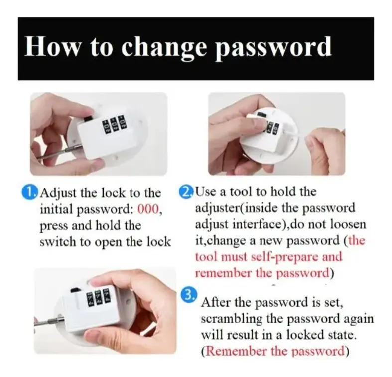 Incluye una cerradura, dos cintas adhesivas y tornillos