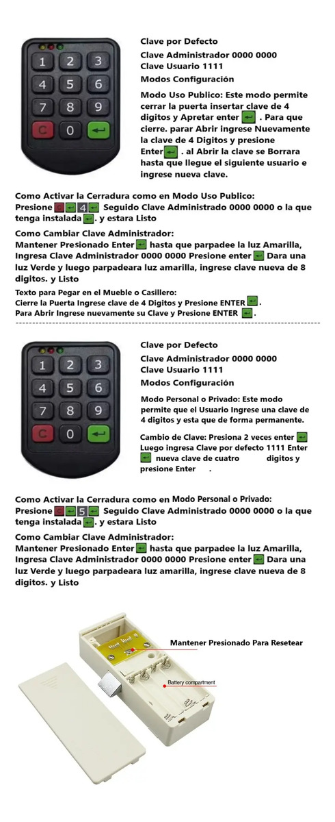 2.- Para cerrar. Cierre la puerta e ingrese clave que usted elija y presione enter o flecha vede el pestillo cerrara. (Use una clave de 4 dígitos o mas que usted pueda recordar Fácilmente)