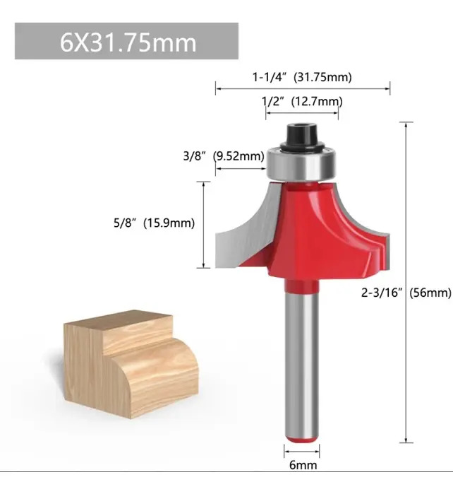Fresa Madera Cuarto Rodon 3/8, 9.52mm Vástago 6mm 1pc