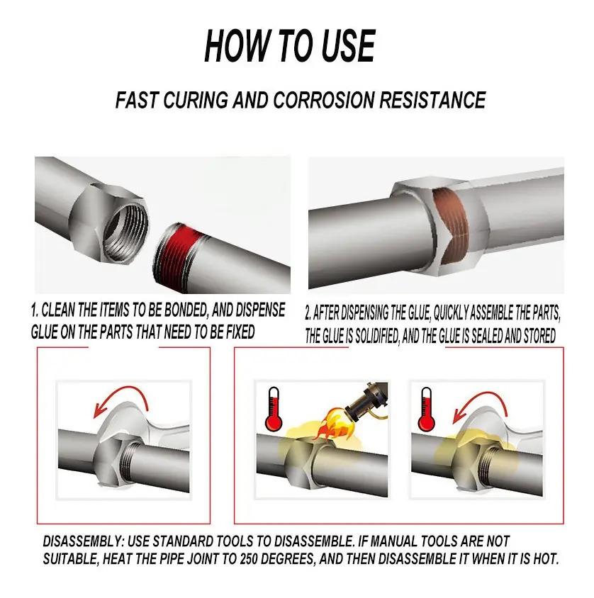 El sellador de rosca de tubo anaeróbico tixotrópico de resistencia media, fácil de desmontar, de un solo componente se cura entre dos superficies metálicas muy ajustadas Cuando se aísla del aire.