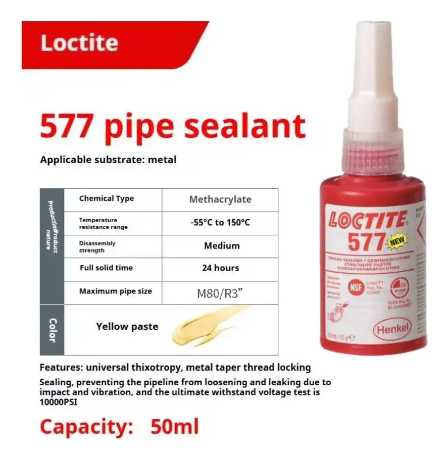 LOCTITE® 577 está diseñado para fijar y sellar tuberías de metal, así como conexiones metálicas roscadas. Proporciona sellado instantáneo a bajas presiones. No se deforma, ni se contrae y no bloquea el sistema Presenta excelente resistencia química y térmica. Su naturaleza tixotrópica reduce la migración del producto líquido tras su aplicación sobre el sustrato.