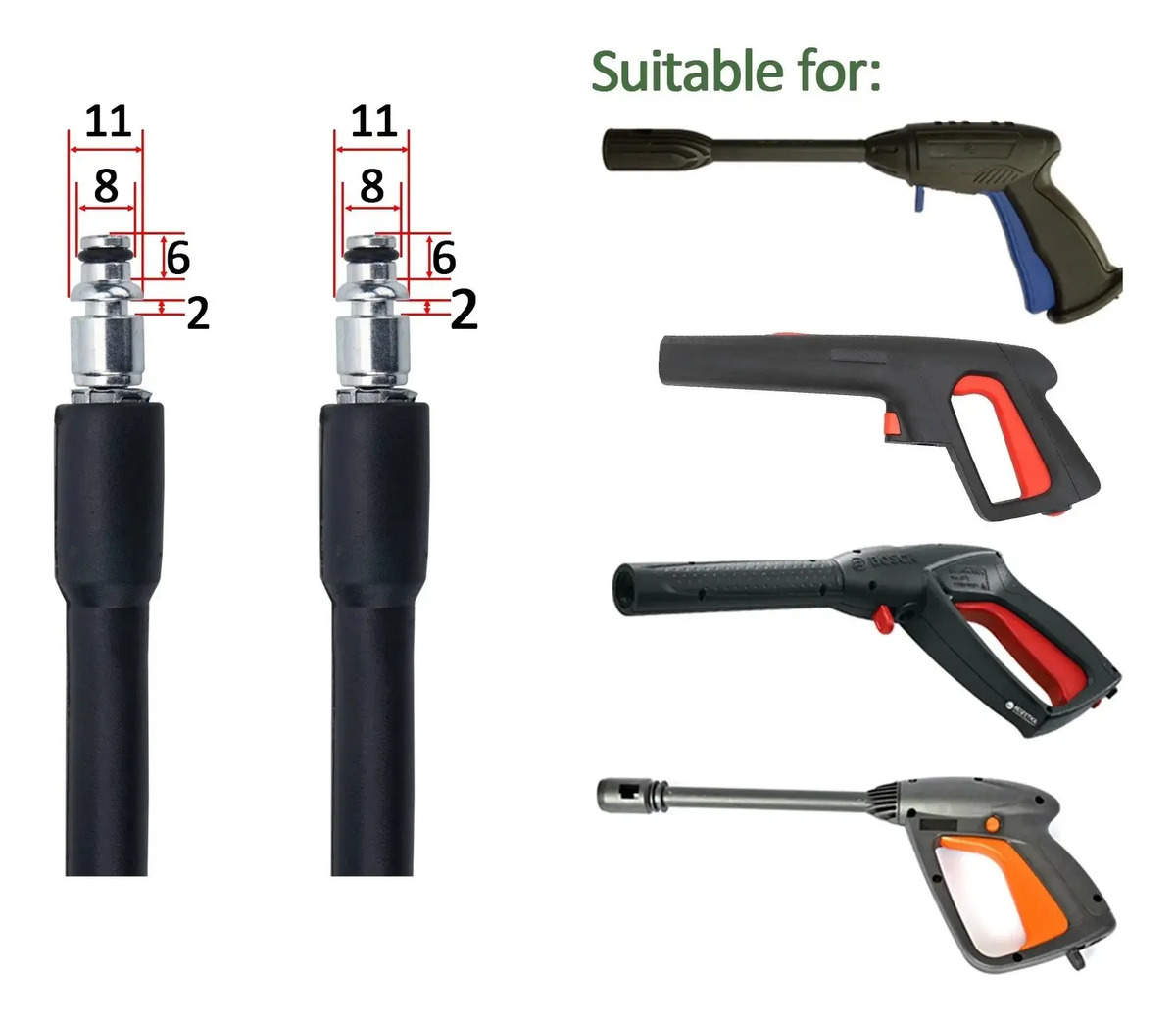 La manguera se fija a la pistola y a la hidrolavadora mediante sistema de acople rápido (en ambos extremos).