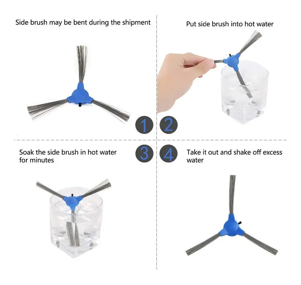 Si los cepillos laterales se doblan debido al envío, repárelos simplemente remojándolos con agua tibia durante varios minutos. No afectará a la calidad y el rendimiento.