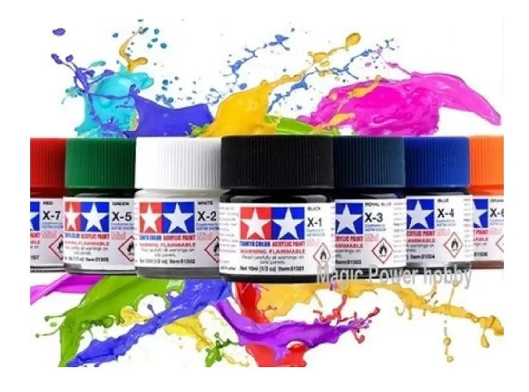 | Colores | Black, Blue X-4, Bronze, Brown X-9, Chrome Silver X-11, Clear, Clear Blue X-23, Clear Green X-25, Clear Orange, Clear Red X-27, Clear Yellow, Flat Base, Gold Leaf X-12, Green X-5, Gun Metal, Lemon Yellow X-8, Light Green X-15, Metal Brown X-34, Metallic Blue X-13, Orange, Park Green X-28, Pink X-17, Purple X-16, Red, Royal blue X-3, Semi Gloss Black, Semi Gloss Clear X-35, Sky Blue X-14, Smoke X-19, Thinner, Titan Gold, Titan Silver X-32, White |