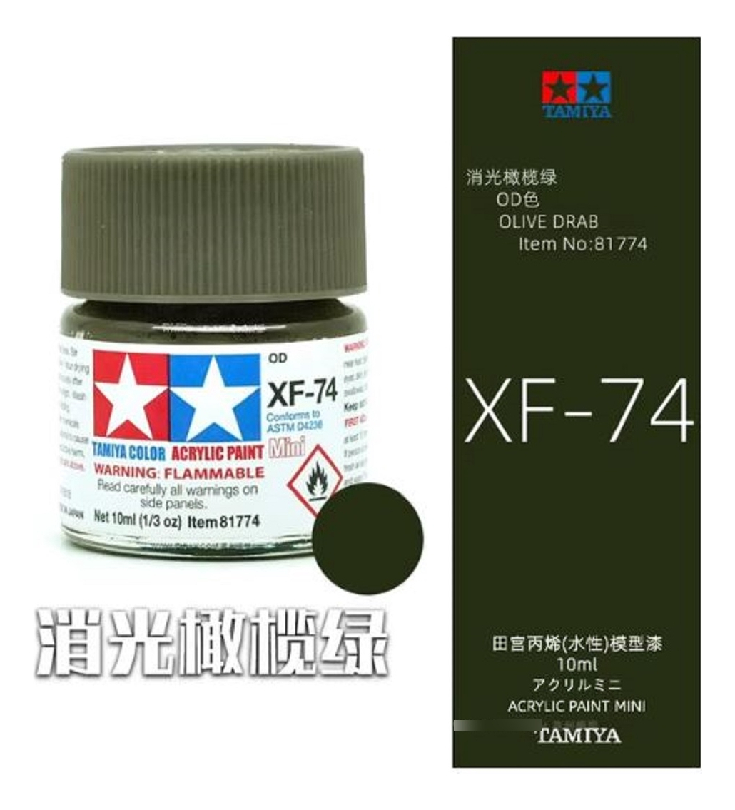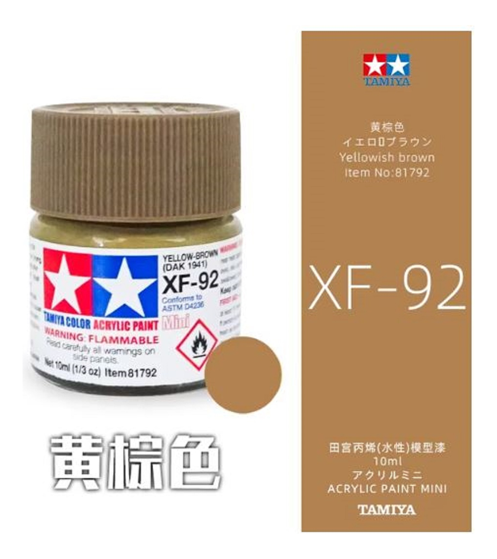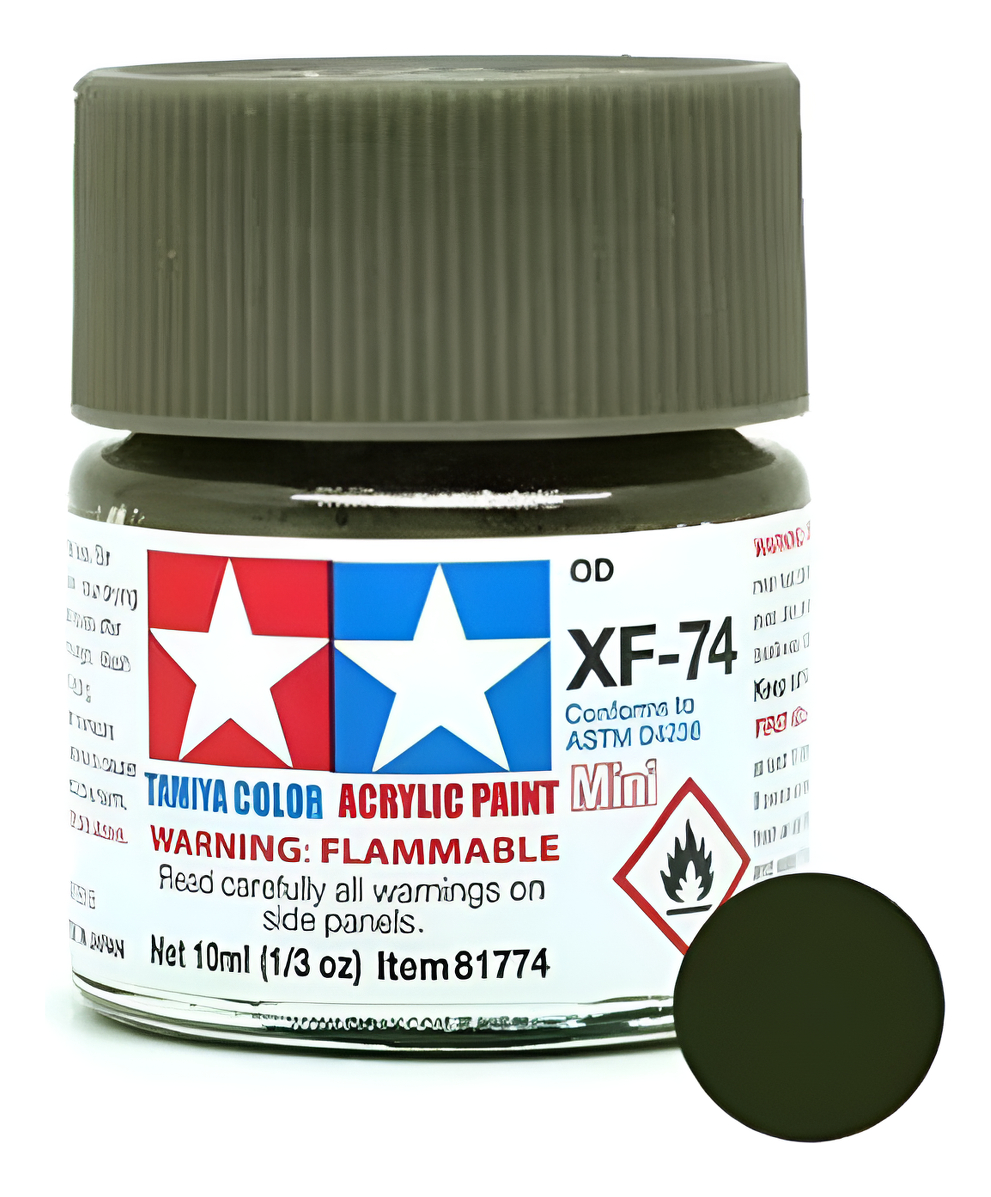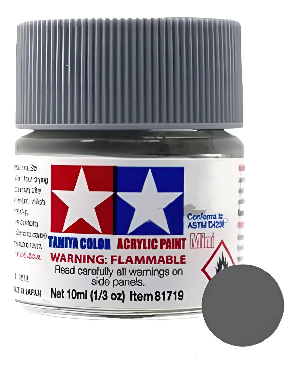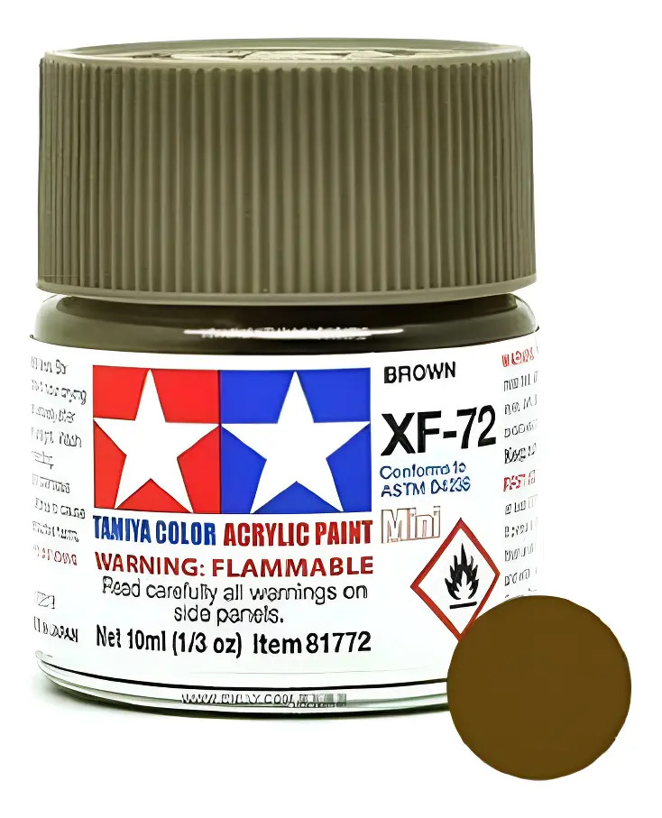Las pinturas acrílicas de Tamiya están hechas de resinas acrílicas solubles en agua y son excelentes para pintar con pincel o aerógrafo y son completamente seguras. Estas pinturas se pueden utilizar en espuma de poliestireno, madera y plásticos modelo más comunes. La pintura cubre bien, fluye suavemente sin rubor ni decoloración, y se puede mezclar fácilmente. La pintura se puede lavar con agua normal si se hace antes de secar.