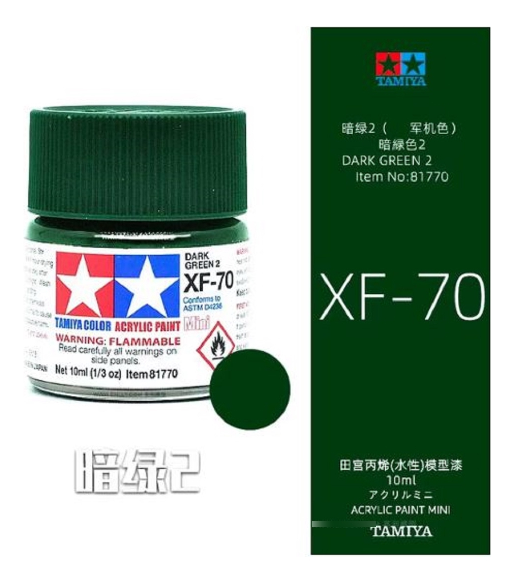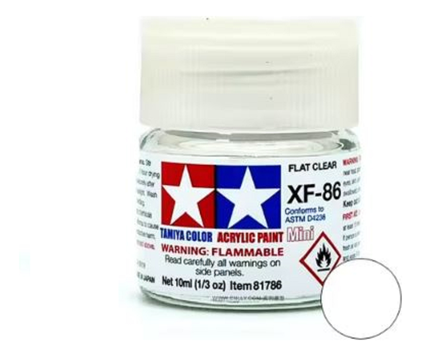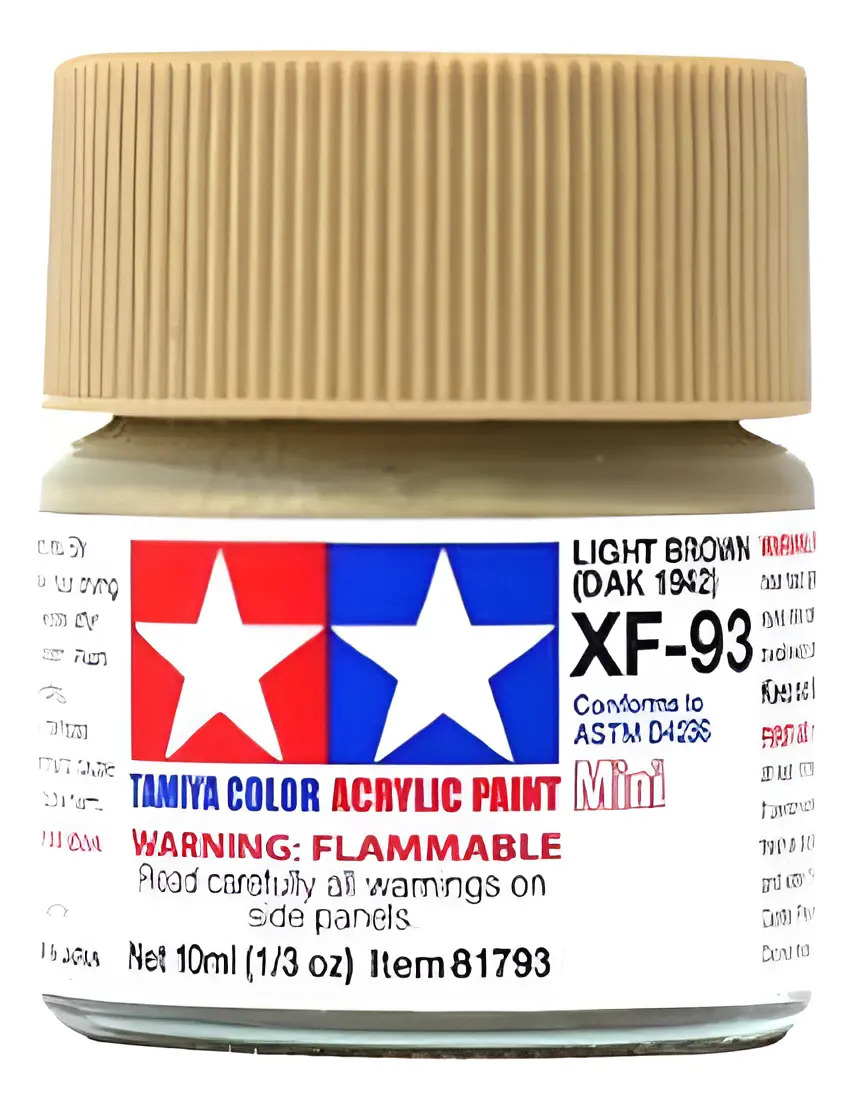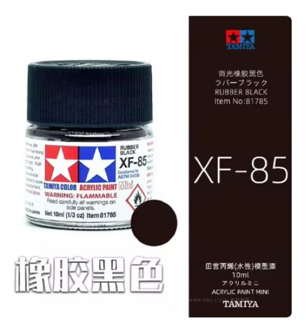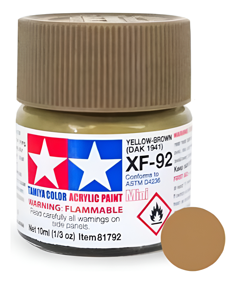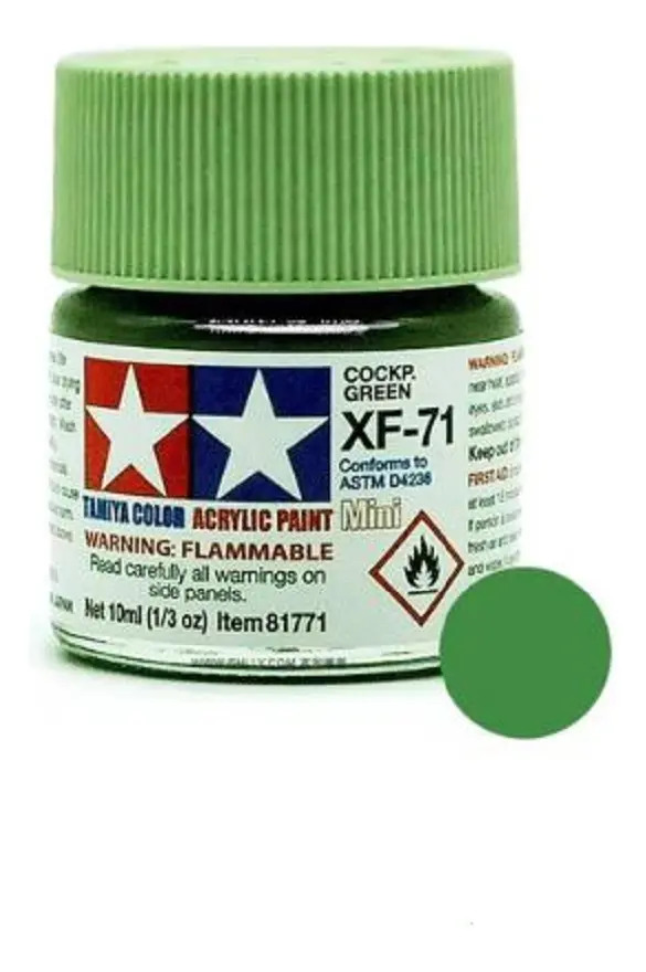 Las pinturas acrílicas de Tamiya están hechas de resinas acrílicas solubles en agua y son excelentes para pintar con pincel o aerógrafo y son completamente seguras. Estas pinturas se pueden utilizar en espuma de poliestireno, madera y plásticos modelo más comunes. La pintura cubre bien, fluye suavemente sin rubor ni decoloración, y se puede mezclar fácilmente. La pintura se puede lavar con agua normal si se hace antes de secar.