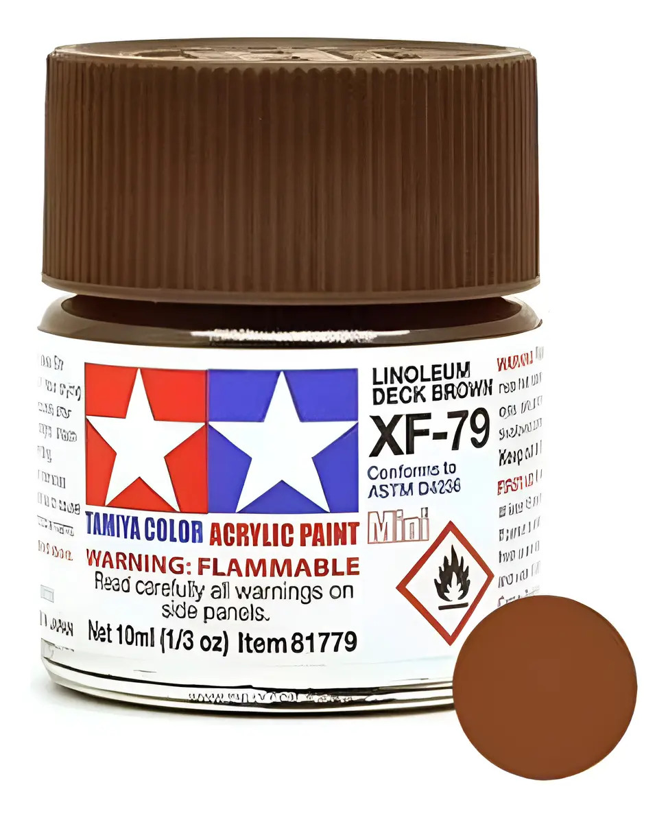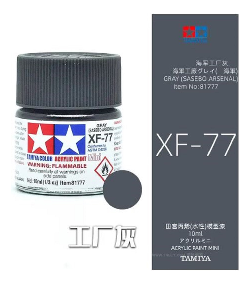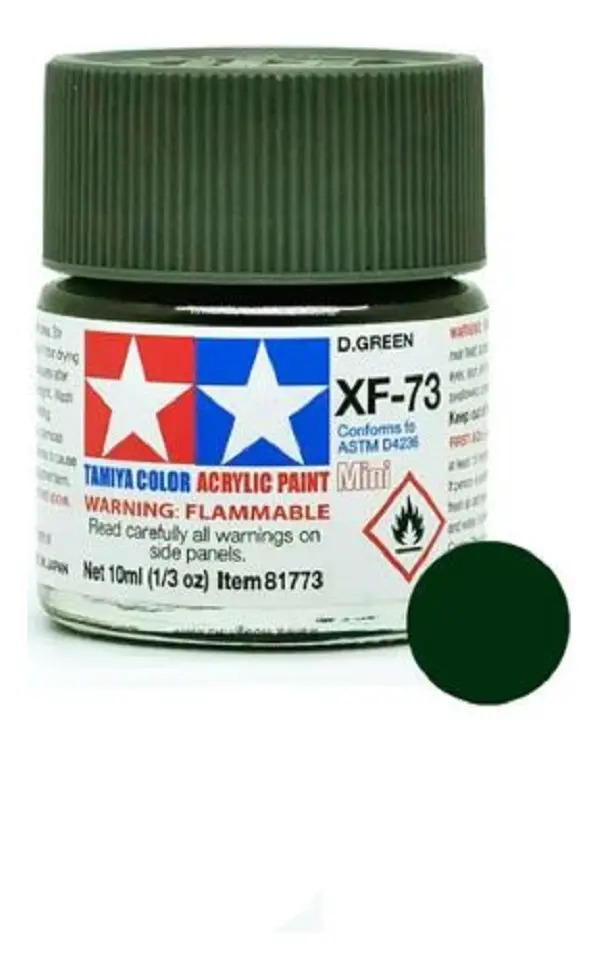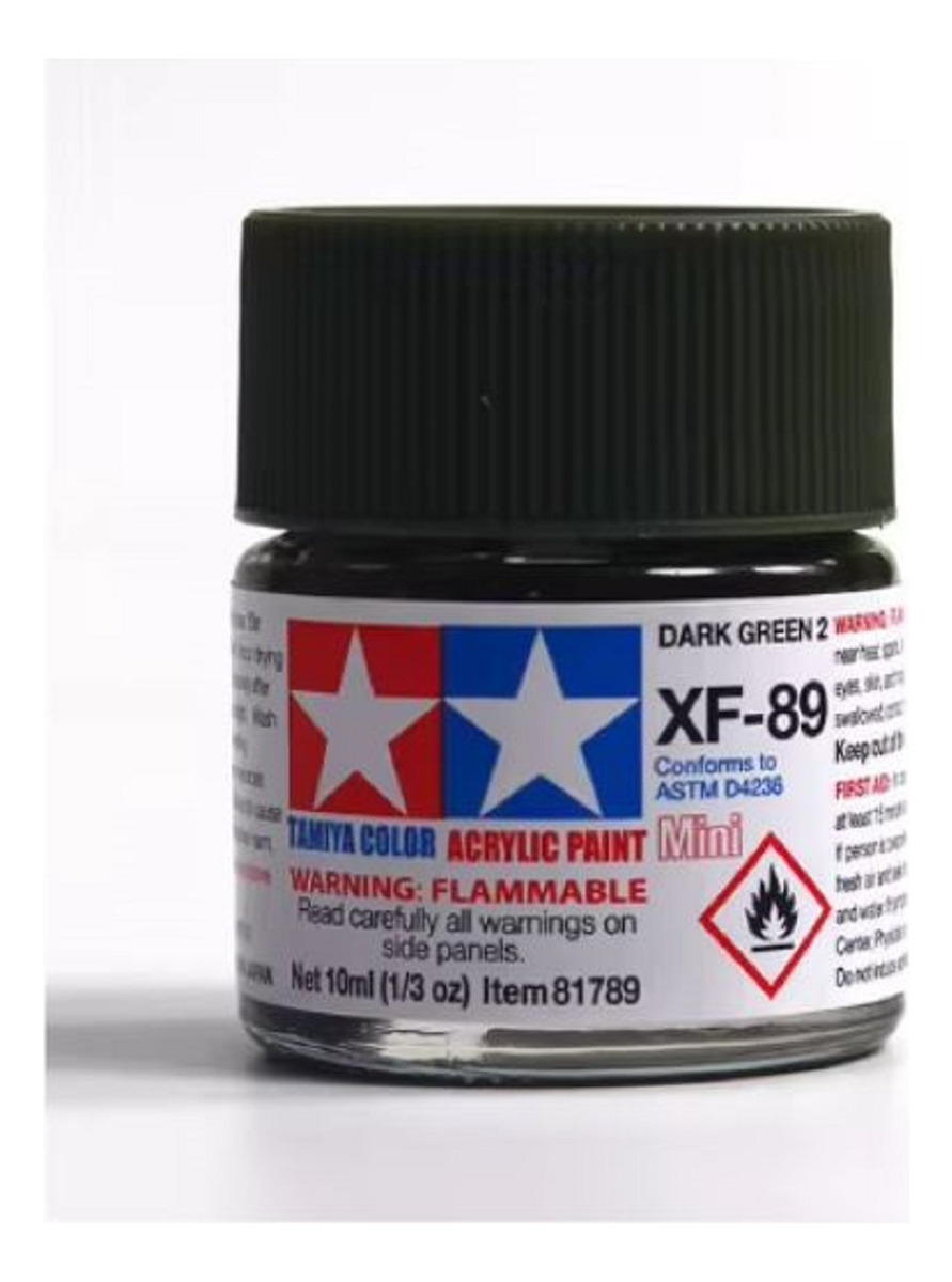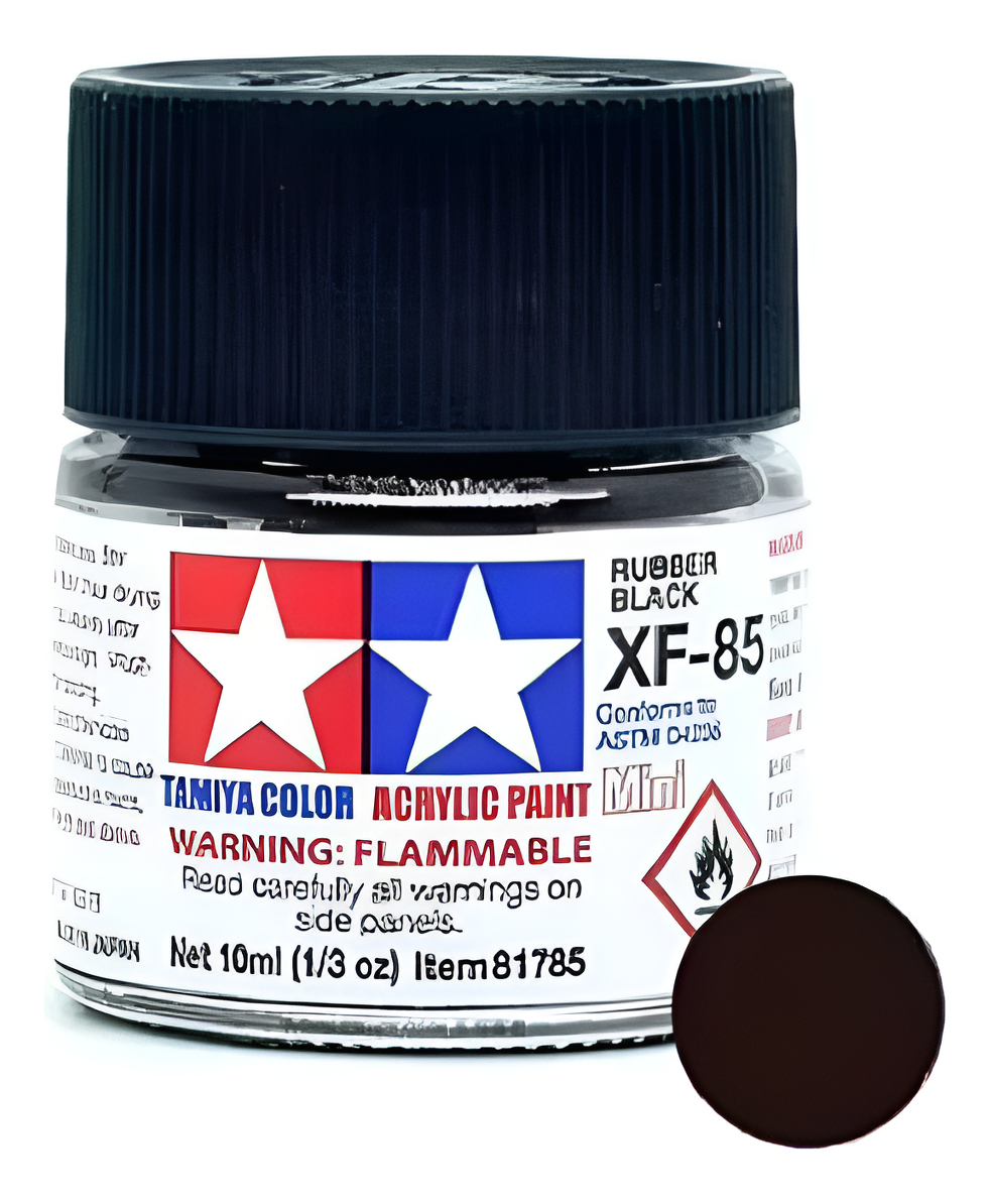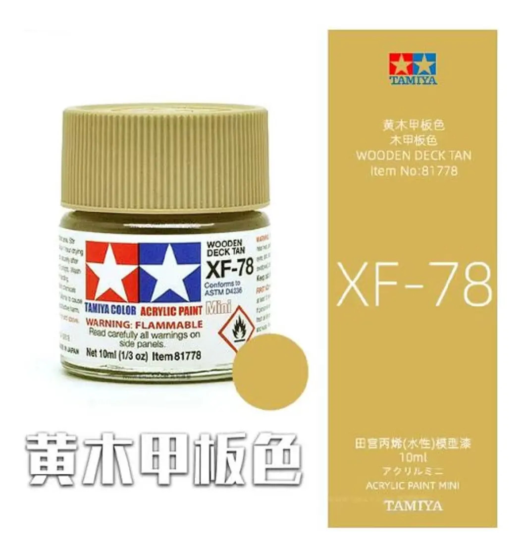 Las pinturas acrílicas de Tamiya están hechas de resinas acrílicas solubles en agua y son excelentes para pintar con pincel o aerógrafo y son completamente seguras. Estas pinturas se pueden utilizar en espuma de poliestireno, madera y plásticos modelo más comunes. La pintura cubre bien, fluye suavemente sin rubor ni decoloración, y se puede mezclar fácilmente. La pintura se puede lavar con agua normal si se hace antes de secar.