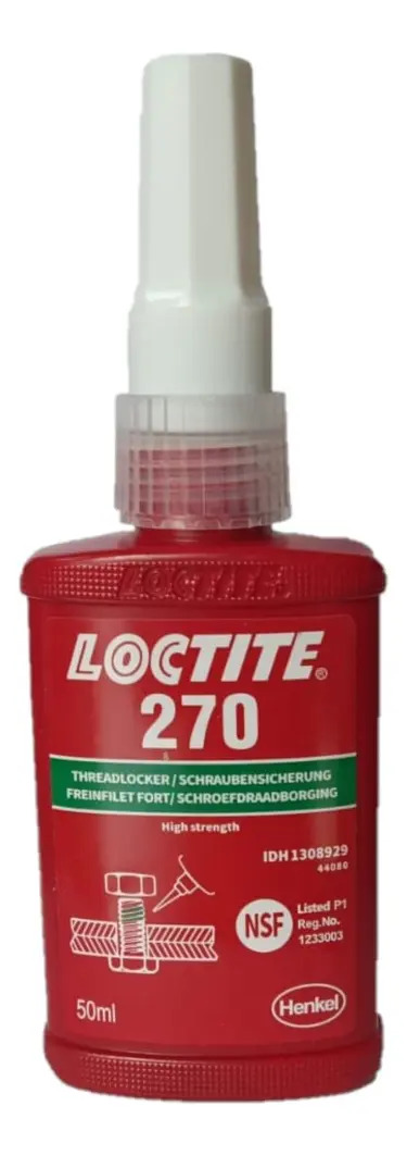 Nombre del producto: Loctite 270Especificaciones del producto 50mlColor: verde líquidoTipo químico: metacrilatoViscosidad: 400-600 mpa, sPar de ruptura: 16-36nmVelocidad de curado: